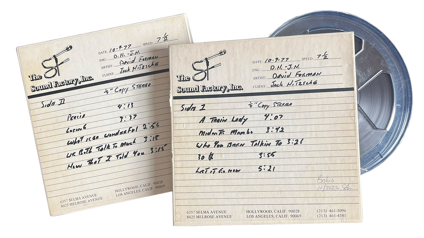 We were also eager to confirm an online rumor: Was it true that Forman recorded a second record for Arista in 1977, produced by none other than Jack Nitzsche? The storied arranger and keyboardist had virtually invented Phil Spector’s Wall of Sound in the early ’60s, putting his fingerprints on classic recordings by the Ronettes, Jackie De Shannon, and the Righteous Brothers. He’d performed as a sideman to the Rolling Stones, produced Neil Young’s Harvest, scored the soundtrack to One Flew Over the Cuckoo’s Nest, and married Buffy Sainte Marie.